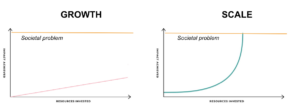 The other key difference between growth and scale is concerning resources. We know that any expansion of impact will take at least some increase in capital or human resources to get there. Growing typically involves adding resources at the same rate as adding impact, leading to a linear increase. Scaling differs in that it tends to add resources at an incremental rate to achieve an exponential increase in impact. In other words, reaching further with less.